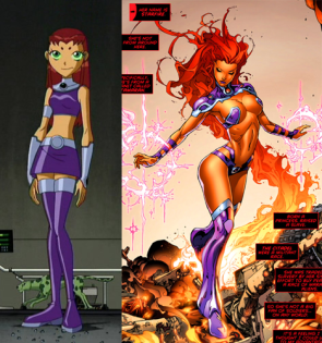 I agree that a fair comparison can’t really be made, since one is a television show for children and the other is a comic for 13+. The reason I included her Teen Titans outfit was to a) emphasize the sexuality of her new getup, and b) create a juxtaposition between the interpretation of the character that kids like and are comfortable with, and the way she’s depicted in the comics, which they might be led to read as a result of their familiarity with her.