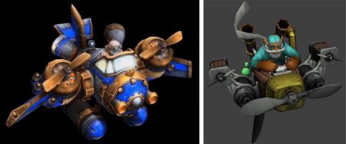 The top two images on the right are a Goblin Shredder, first in WarCraft III and then in World of WarCraft. Below them is the Timbersaw hero from Dota 2. There are obvious differences, of course, but I don’t think it’s a stretch to say that the latter is taking more than a few pages from the former. It remains a goblin with goggles sitting within the exposed cockpit of a mech that is ostensibly meant to cut down trees.