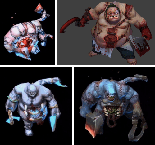 Clockwise from top left: an Abomination in WarCraft III, Pudge in Dota 2, Stitches in Heroes, Stitches in World of WarCraft.