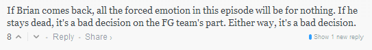Here’s the thing, everyone, Family Guy is a comedy. Comedies by definition must be funny, and that’s why even when Brian was bleeding and broken in the street we ended with a joke before cutting to commercial. Heck, the funeral had a handful of gags, one of which was really funny [Joe the cop being beaten around the head with a purse by a Black woman]. They kept it pretty sombre, but ultimately this is a show that’s meant to make us, at the bare minimum, smile.