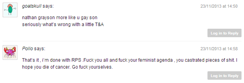 RPS: I have to add, though, that comics might not be the best point of reference for this sort of thing. I mean, it’s a medium that’s notorious – often in a not-good way – for sexing up female characters and putting them in some fairly gross situations.