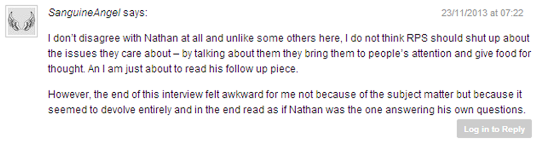 Hoo boy, I bet Nathan Grayson sure regrets his surname now. But I digress, much like most of the comments on the RPS article. I am going to assume that some of these people, goatskull and Pollo fully excluded, had some decent thoughts to contribute to the issue that was being broached. This was of course derailed by how it took place within the interview, which leads me to believe that the only way to get us back on track is to conduct another interview. With myself.