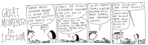 Translated in simple English, that comic is saying that Sawant’s victory doesn’t really mean that people are becoming revolutionary and that her victory doesn’t mean all that much. My response to that would be as follows: