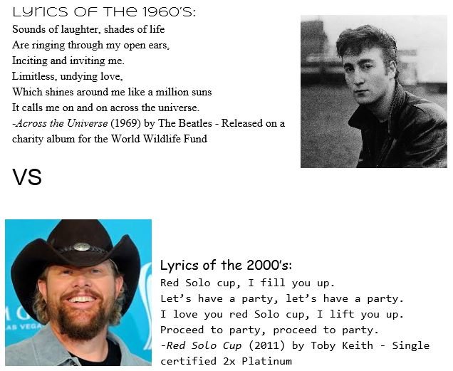 While this is pretty indicative of what sells, it’s absolutely not representative of what is or isn’t being sung about overall. We have more musicians now than ever before [in part due to having a higher population, sure] and for every star there are dozens upon dozens who haven’t made it yet, and maybe never will. It’s not to say that they aren’t talented, just that exposure ain’t easy.
