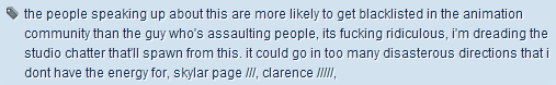 Let me reiterate that first line again: “the people speaking up about this are more likely to get blacklisted by the animation community than the guy who’s assaulting people.” Animator Geneva Hodgson shines some additional light on the situation: