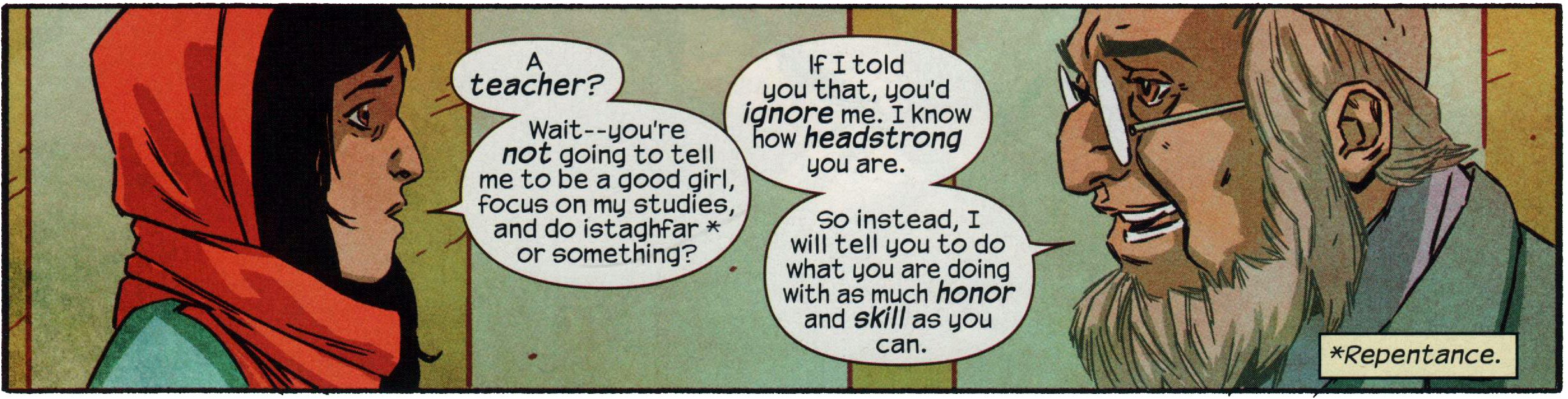 For starters we finally see the return of Sheikh Abdullah, the Khans finally coming through on their threat to force their daughter to meet with him. Last we saw the man writer G. Willow Wilson was critiquing certain aspects of Islam, a move that I found genuinely surprising [in a good way]. In this issue she continues to paint a complex picture of the religion.