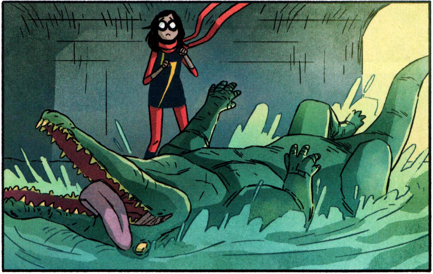 The Adorable Ms. Marvel Drawing You Shouldn’t Have Missed: I had to tweak this feature given the distinct lack of visual gags, and thought it would be appropriate to note just how cute [a word that bears no negative connotations here] Jake Wyatt can portray things. In this case, Kamala as she worries about the alligator she just punched right in the gullet.
