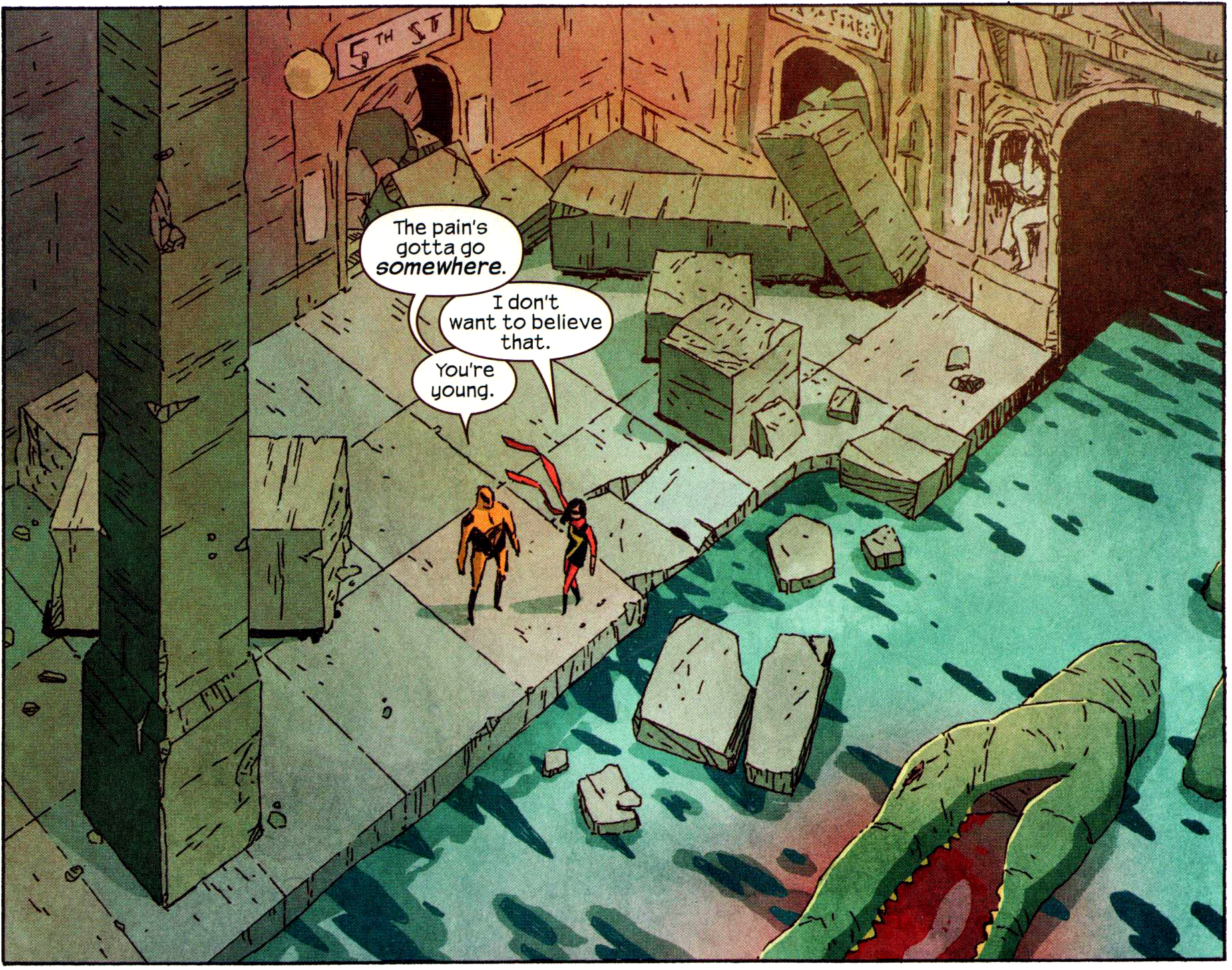 If I want to be honest with all of you, which I do, the fact is that comic book characters don’t change all that much. That’s a gross overgeneralization, so let me backtrack a little: comics don’t change quickly. Sure, between 2010-2011 Spider-Man had this whole “no one dies” thing that strongly affected the way he behaved in situations for months to come, but it took like three whole issues. We’re just past the half-dozen mark with this comic, and Kamala’s already learning things that are going to stick with her for years [yeah, this title’s not going anywhere] to come.