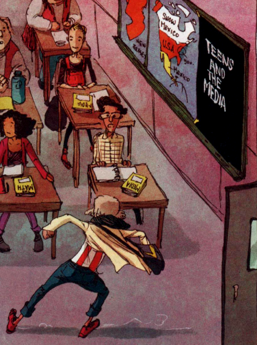 Where things get really interesting is when yet another mech crashes into the classroom, having used an adorable little matchbox-sized robot that snuck into Kamala’s boot as a homing beacon. Here we’re presented with the age-old conflict of having to save the day without letting those closest to you catch wind of your secret identity. Luckily for our heroine, she has shapeshifting powers!