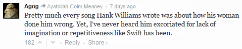I just want to mention that I’m fully aware I said earlier that this was going to be a shorter post and I’m pushing 700 words. That aside, Agog’s point is a cogent one, and frames the aforementioned double standard within the realm of music. Why is it that male musicians haven’t been criticized in the same way that Swift has in spite of covering the same topic in their own material? Furthermore, isn’t she just continuing on in the country music tradition of “done me wrong” songs?