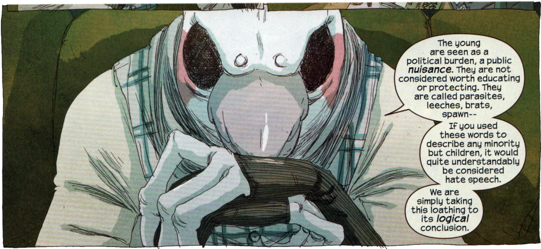 “The young are seen as a political burden, a public nuisance. They are not considered worth educating or protecting. They are called parasites, leeches, brats, spawn– [. . .] We are simply taking this loathing to its logical conclusion.”