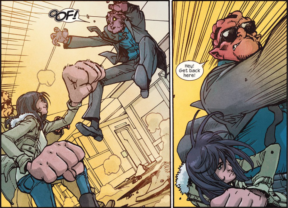 Fights, Panelling, Action!: Miyazawa makes great use of action lines here, which communicate movement and add to the dynamism of the fight scene. Once again he draws your eye across each panel using the characters, with the panel on the left encouraging us to follow Kamala’s body from the bottom left-hand corner to where it ends in the Inhuman guard’s midsection in the upper right. Props to Ian Herring on colours as well, as washing everything else out keeps the focus solely on the combatants.