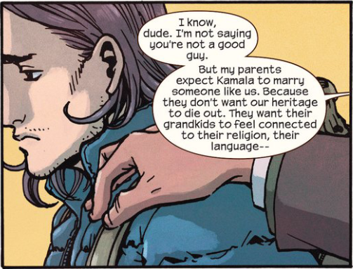 Yes, the very handsome Kamran is very much still a factor, and yes, he is also an Inhuman. Just in case it wasn’t a big enough deal that he is also a nerdy Pakistani-American it just so happens that he too was given powers by the Terrigen Mist that gave Kamala the ability to embiggen, etc. How his story intersects with our heroine’s and proceeds is fairly straightforward, so I thought I would draw your attention to two parts of the narrative that can be told given who Ms. Marvel is, specifically.