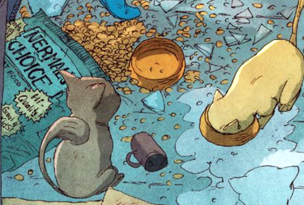 The Ms. Marvel Visual Gag You Shouldn’t Have Missed: There were a lot of really fantastic ones in this issue, particularly in the panels where Ms. Marvel and Captain Marvel leap and fly, respectively, over the city. With that in mind I decided to keep this one pretty low-key and spotlight the cat food that was left behind. Nermal is, of course, Garfield’s adorable nemesis from the popular comic strip by Jim Davis. The food is also “Great 4 Kids!” which is a big plus.