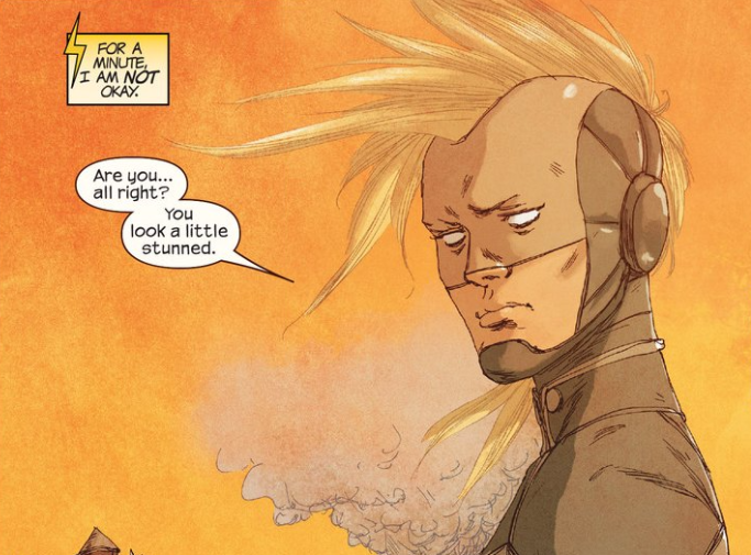 She first spots Captain Marvel in the monochromatic costume she can first be seen wearing in Avengers #35, published last November. For anyone wondering why her look differs so much from the cover to this issue . . . Long story short, this was when Danvers was part of S.H.I.E.L.D.’s Avengers during a time when the Earth’s Mightiest Heroes were split into multiple factions, with one striving to prevent the apocalypse in secret, another trying to apprehend the first, a third with the aim of bringing everyone under one banner . . .