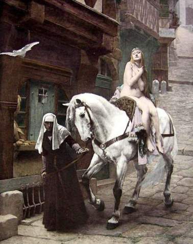 According to legend, Lady Godiva rode through town naked in order to convince her husband to lower his taxes on the people of Coventry. This rendition is by Jules Joseph Lefebvre