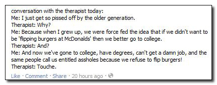 It’s a great little bit, but I still have to stop things right there. We’re not ashamed to take manual labor jobs. We never have been. In this economy more than ever, there are college graduates willing, ready, and even eager to take jobs sweeping floors, unloading crates, answering phones, or stocking shelves. We’re not ashamed of flipping burgers, we just can’t afford to flip burgers. See, we have this funky little thing called “debt”, and not just any debt, the one kind of debt we, by law, cannot have discharged. To clarify- if I went bankrupt, if fire burned down my house and destroyed each and every last earthly possession I had, the only thing I would have left would be tens of thousands of dollars of debt I still need to pay.